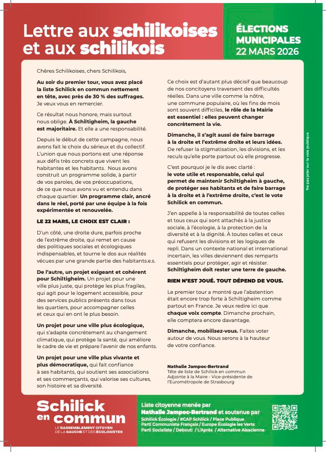 Pour que Schiltigheim reste une terre de gauche, une ville dans laquelle il fait bon vivre, grandir et vieillir, un seul bulletin : Schilick en commun.